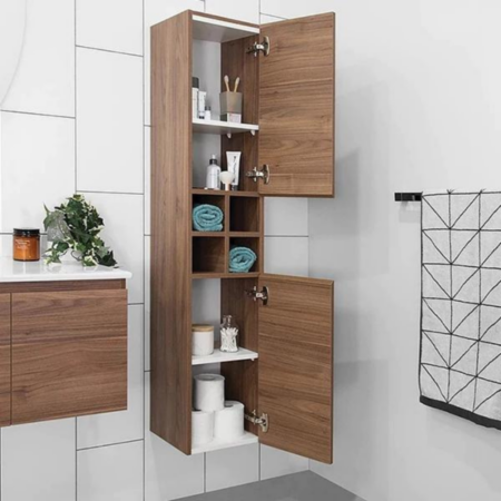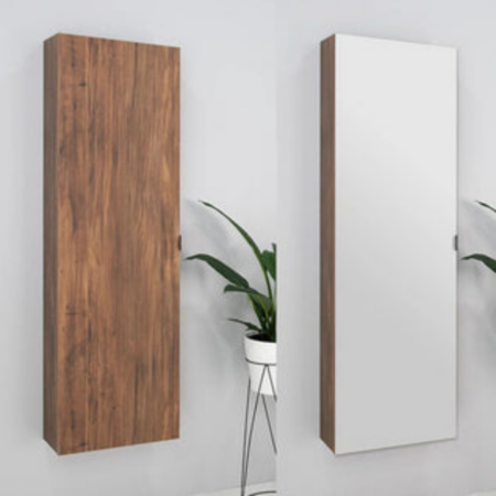 $909.00 – $1035.00- Stylish wall hung bathroom tallboy design available in woodgrain front or mirror front