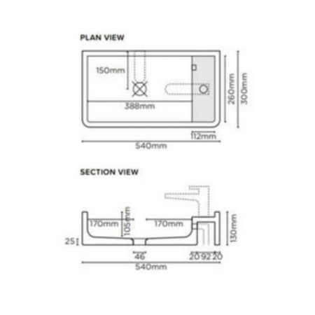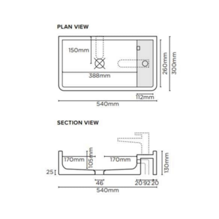 - Basin Size: L 540mm x D 300mm x H 130mm
